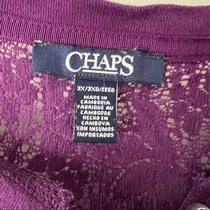 Deep purple long sleeve henley shirt with lace shoulder and neck line and buttons in front