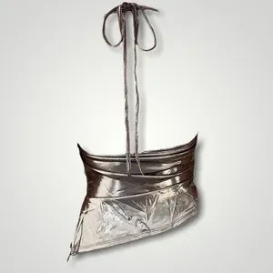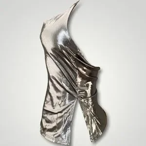 Features a simple, yet show stopping chrome finish ✨ Drapes over your body in the most flattering way in the iconic asymmetrical, low back halter style.