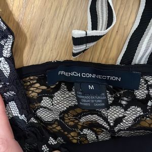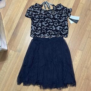New with tags French Connection set. Navy tulle tutu style skirt with navy and white floral lace crop top. Striped bow ties in the back. Willing to separate but prefer to sell as a set. Top is a size medium skirt is a size 6.