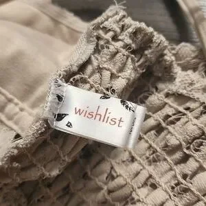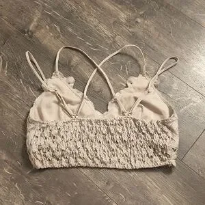 This bralette is perfect for layering. Pair with an off-the-shoulder sweater or a tank top to complete the look. The beige color makes it ideal for wearing with almost any color top. No padding included, but there are openings if you'd like to add your own. Purchased from a local boutique and only worn a few times. Great condition. Smoke-free home. Straps are adjustable and the fabric is very stretchy.