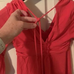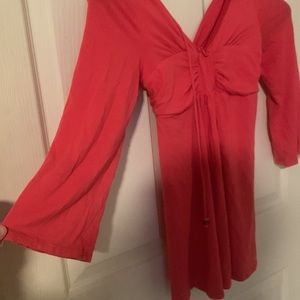 Ella moss 3/4 length sleeves. 3 panel front gathered in at bust with bra top. Very flattering top. Long ties with beads at the end, ties in back. Excellent condition. Slight faded red.