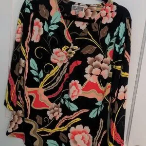JM Collection petite large polyester top with gold accent flower design measures about 18 in across flat and 26 in length.