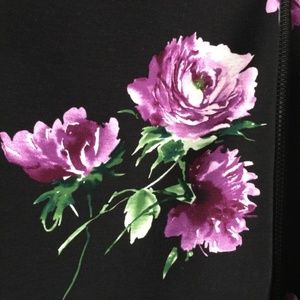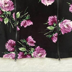 Fun and bold flower print skirt with flirty functioning double zippers at the front, comfortable ponte knit in knee length style. wide elastic waist, fabric has stretch, kick vent in back, excellent used condition.