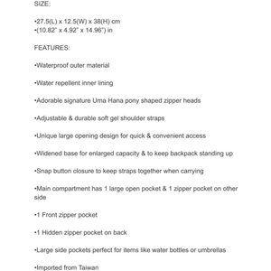 This is a high quality, brand name Uma Hana, Large Backpack. It is fashionable & functional with waterproof outer material & water repellent inner lining.