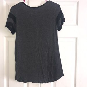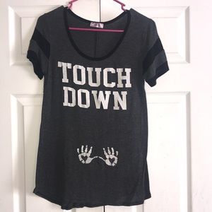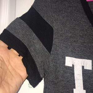 Dark gray maternity top is soft & comfortable. Scooped neckline in bordered in black; wider black stripes on the sleeves. White graphics have minor cracking on lettering & on baby’s hands. Back seam & a curved hem. Shirt a bit worn but no stains, holes or rips. Still plenty of life left to enjoy wearing this adorable tee! Sz S.