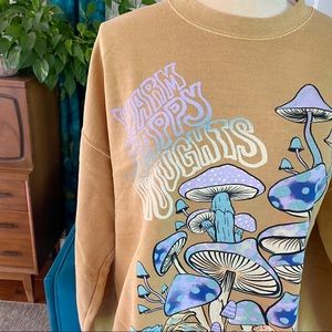 Project Social T Warm Happy Pullover Sweatshirt in the color Mustard, a muted earthy, vintage-washed Mustard yellow color (like a Dijon mustard color) with a large graphic on the front in retro psychedelic lettering that says “Warm Happy Thoughts” with mushrooms shrooms in lavender and aqua / mint green throughout the front.