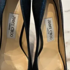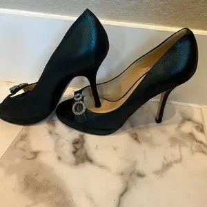 Jimmy Choo - Forest Green - Satin - open-toed pumps with rhinestones accents; just wore for a test around house but I did get the bottoms a little dirty; comes with dust bag - actually not sure if this dust bag is for these shoes. I used to have a lot of Jimmy Choo shoes and bags so this is the last bag; size 7 1/2; 37 1/2