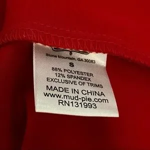 Vibrant elegant and classy red bell sleeve stretchy polyester dress by Mud Pie. Flowy and comfort fit. Features bracelet length sleeves with bell embellished detail and keyhole back closure. Great dress for holiday and cocktail parties.
