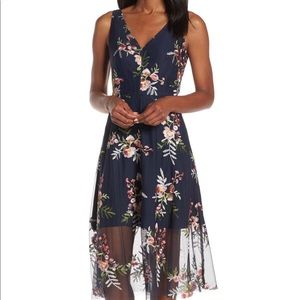 Navy floral fit and flare dress. V-Neck, mesh overskirt midi length. Worn one time