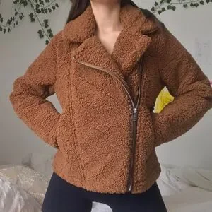 brown sherpa teddy jacket. faux leather inside and shift sherpa on the outside. the collar can be flipped up to cover the neck or kept down. the zipper makes this coat so unique as it zips up on the side.