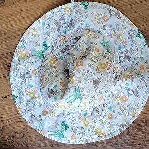 Deer print hat is size 2-4T with an adjustable strap. The pink floral hat is size 12-18 months with a velcro strap. Always open to reasonable offers through the offer button!