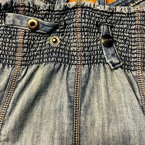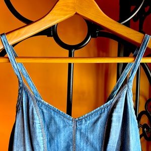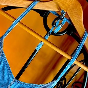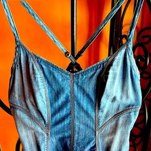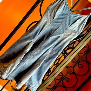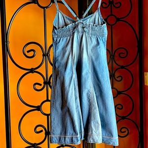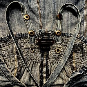 EUC Pretty ARMANI EXCHANGE A/X Denim dress with stitching and subtle distress details. The fabric and fit are amazing. Thin straps with three gun metal toned snaps on each strap making it easier to adjust to a halter, criss cross or straight strap look (see pictures). Elastic on back with side zipper on left side. Bottom flows, very chic. 100% Cotton. Should you have any questions, please do not hesitate to ask. Thank you for visiting my closet. 💐