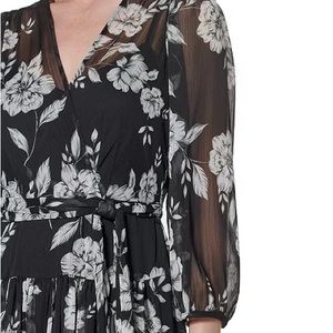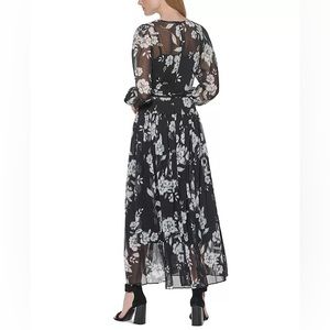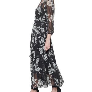Make a sweeping statement in Calvin Klein's faux-wrap maxi dress. This semi-sheer printed style is finished with a sash at the waist for definition.