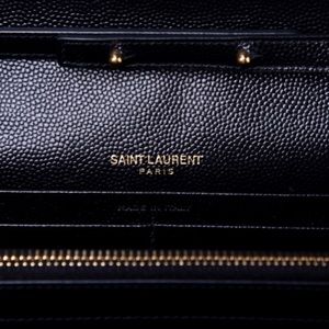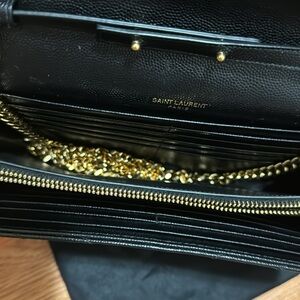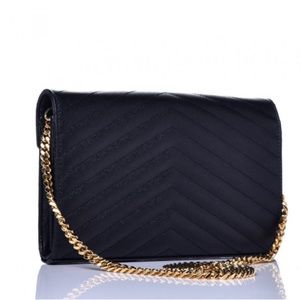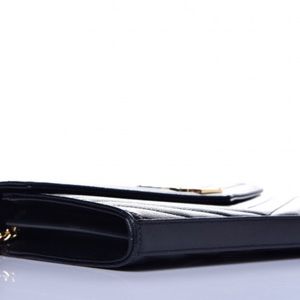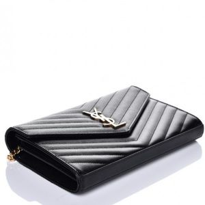 This is an authentic SAINT LAURENT Grain De Poudre Matelasse Chevron Monogram Chain Wallet in Black. This elegant wallet on a chain features a sleek chevron quilting textured leather in black. The bag features a facing flap with a prominent YSL monogram logo. The flap opens to a partitioned leather interior with card slot panels, patch pockets, and a central zipper compartment.