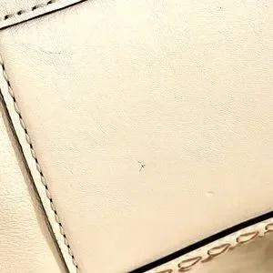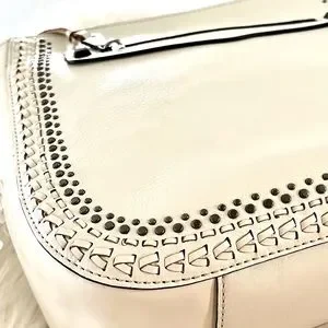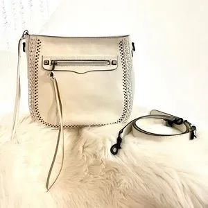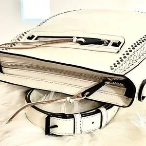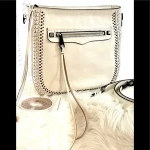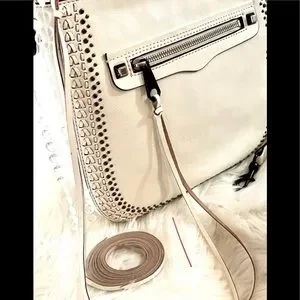 EUC White studded braided leather Rebecca Minkoff leather crossbody bag! Gorgeous bag! Lots of features!! Comes with extra leather strips to embellish this beauty more if you wish! Perfect condition with the exception of one small mark shown in last photo. Features black interior, hardware and trim. Stunning bag!! Measures 11” across, 10” high, and 4.5” wide at the bottom. Drop is 19.5” and is adjustable. All measurements are approximate. Love 💗 it, but your budget doesn’t? Try interest-free payments with Affirm! 🤩