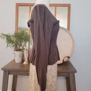Final Touch Taupe Peasant Top ruched bodice in front and back with square neckline. Brand new, never worn.