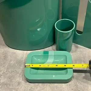 Vintage seafoam teal plastic bathroom accessories waste bin cup soap dish tissue. Set is in used condition. See all photos for details and measurements. There are no chips or cracks, however, there are some small surface scratches as shown in the photos.