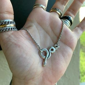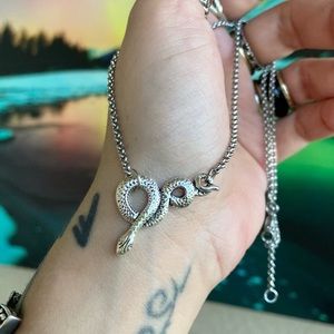 Handmade π€ Snake set ( necklace + matching earrings ) chain is 16 inch long . Chain is stainless steel material . Earrings posts are also stainless steel ( do not change color / rust / allergy free ) . Snakes charms are silver plated . Tags : goth , gothic , rocker , edgy , rock & roll , boho , bohemian , punk , steam punk , chain choker , biker , festival , stylish , trendy , vampire , Halloween , witch , moon child , rockabilly , thick chokers , pin up , fun chokers , clubbing , emo , statement piece , gift , Celt , Celtic , Viking , Gypsies , hippie