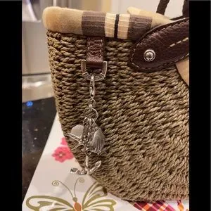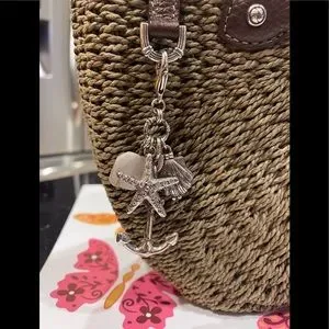 The top secures with a large fabric bow. Front left has a removable set of charms which include a large anchor, a silver shell and a shell, and a crystal embellished starfish.