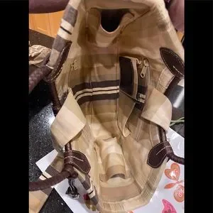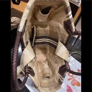 BRIGHTON leather patch inside, and it’s lined in Brighton striped cotton fabric with interior rear and front sidewall zippered pockets as well as two open slip pockets on the rear. The interior sides have open slip pockets as well.