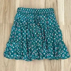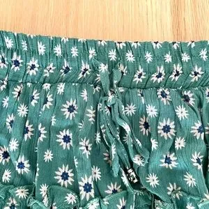 Polly, green, 3 tier, ruffle mini skirt. Green color with blue & white flowers and an elastic waist. Laying flat approximate measurements are 12" elastic waist & 16" length. Super flowy, flirty and fun. Great condition!