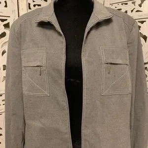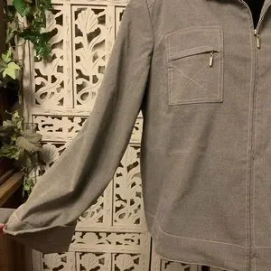 Really nice gray stretchy lightweight long sleeve zip up jacket, lightly textured, silky inner lining, comfort poly/spandex stretchy, zipper pockets in front, light shoulder pads, no snags tears or discoloration, see all pics per additional description… flat approx measurements (Sz/16/XL) (shoulder to shoulder 18”) (pit to pit 23”) (length shoulder to hem 24”)