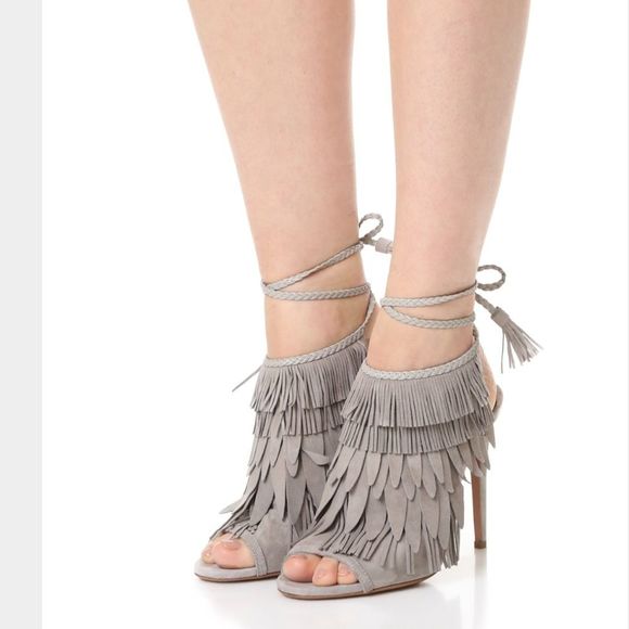 Aquazzura So Pocahontas Sandal 105 in light grey Suede. Layers of Suede cover these smooth Suede sandals. Tassels finish the Braided ties. Covered stiletto heel and leather sole. Heel is 4.25". NWT and original box and dust cover. Pristine Condition. 10B 40 EU.