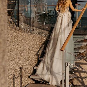 Alterations: Dress was hemmed, took off 1/4 of train to make it easier to walk in, and had a wrist loop added to carry the train.