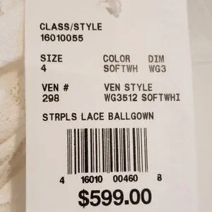 NWT Galina ballgown in soft white. Sz 4, fits more like a 2 and has not been altered. Beautiful lace work, fully lined and still lightweight, has a train and pockets.