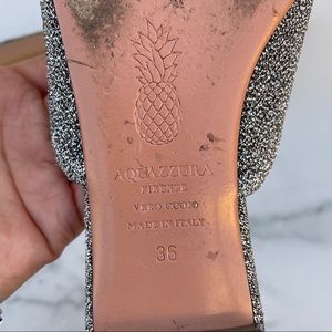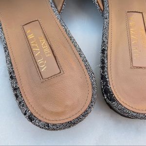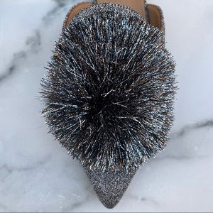 Aquazzura Powder Puff Pompom metallic silver lurex flat mules slippers size 36