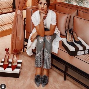 100% authentic Aquazzura Powder Puff Pompom metallic silver lurex flat mules, size 36. As seen on Kendall Jenner and Camila Coelho! There is wear on the soles, and the lurex fabric is slightly worn on the right shoe; view photos. Otherwise, these beauties are in excellent condition! No box or dust bag.