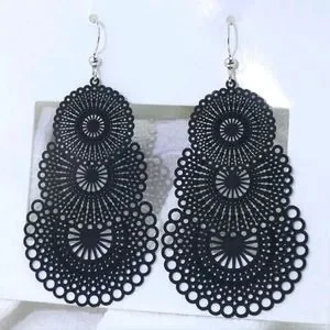 Intricate Cut Layered Lace Style Dangle Drop Earrings, black