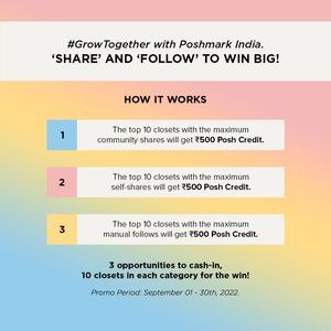 Top 10 Poshers with maximum self shares by the end of the promo period (Sep1-30) will get 500 Posh credit.