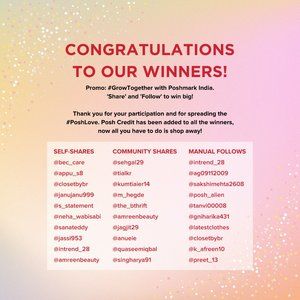 hey gud to know about all the winners. congratulations to all n thnx to poshmark for such schemes.π luckily i m one of the winners....ππ i was just curious to know when this price money would b credited to our account...ππ