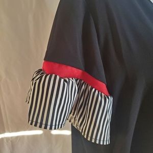 Cute, Comfy Casual, Black, V-neck, Short-Ruffle Stripped Sleeves and Stripped Flowy Bottom, 100% Polyester, Red Accent Lines, Smock Dress, Looks Great with Heels or Flats, Never Worn and Ready for a Day on the Town 😀