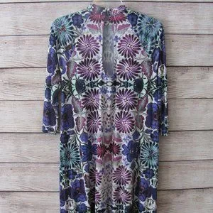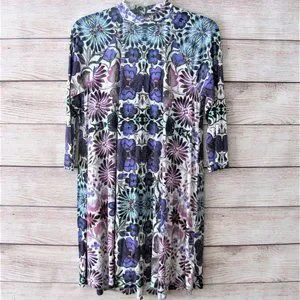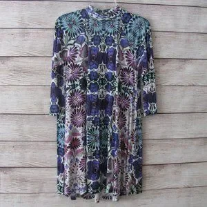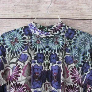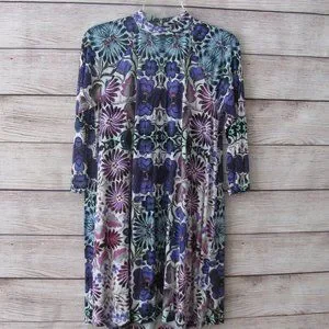 Free People floral print dress. Seventies inspired trapeze cut mini in an overblown fiesta floral print. Three quarter sleeves, mock neck, keyhole cutout at upper back with a double button closure.