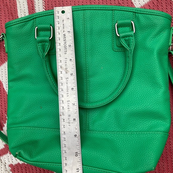 Emerald green bag with detachable strap. A few scuff marks (see photos).