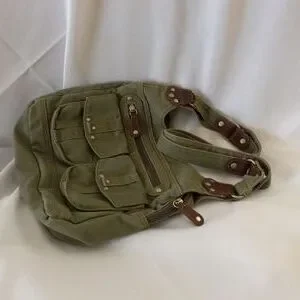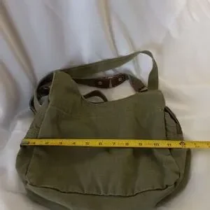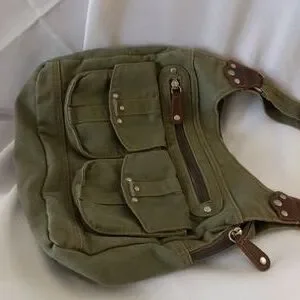 Women's or men's army green cloth bag 2 openings on front with tab and one with zipper 13" long 10" high crossbody straps with faux leather zipper closing