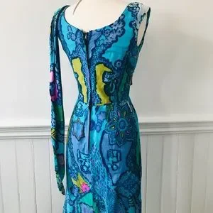 Just wanted to drop by and say that if my waist and hips were small enough, Iโd have snapped up this vintage beauty a while back. Itโs a gorgeous piece that I can see someone wearing out to some of the coolest places. I have a dress that is a bit similar in pattern but shorter that was made custom for my mom and while I could wear it, it was a fun piece. I hope whoever snaps this one up gets to really enjoy it.