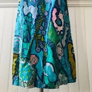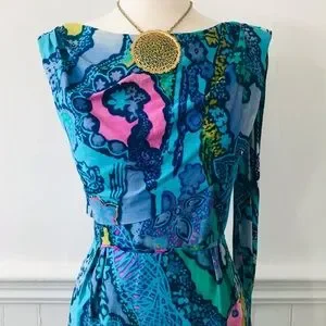 Such a seriously gorgeous dress! Vintage cotton Batik in all kinds of blue shades. Fitted bodice, zipper closure back and slits on each side. Excellent vintage condition, some very light fading but not even noticeable on such a unique piece . Fit for an xs!