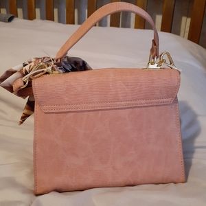 Pink faux snake sking hand bag. 8x8x5 inches. Interior floral two open pockets and one zipper pocket. Adjustable strap.