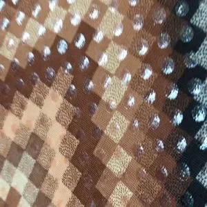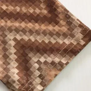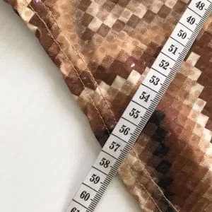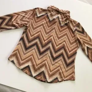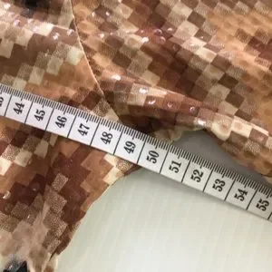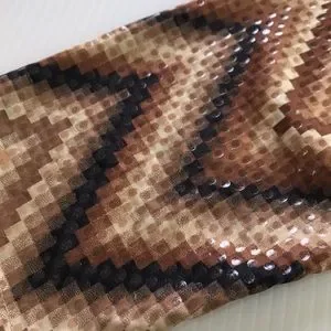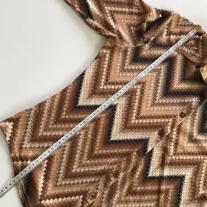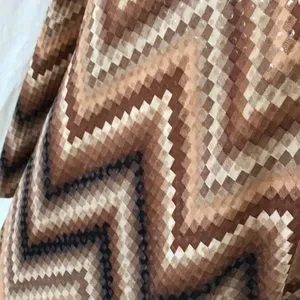 In good pre-loved condition. Fabric is a Chevron pattern in black and several shades of brown and cream. The fabric has that round circle embellishment that looks like a flat sequin but isn’t actually a sequin. See pics for close-up detail.