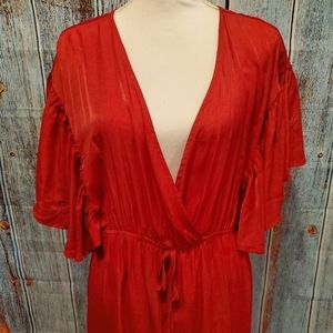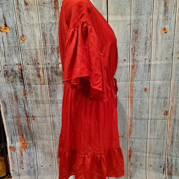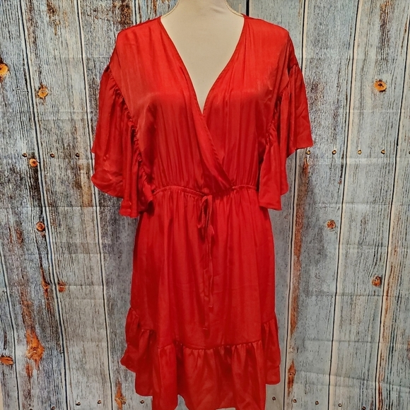 Beautiful Red, Surplice V-neck Cinched Tie Waist, Flutter Short-sleeves, Ruffle Hem, Polyester and Rayon Dress, In Excellent Condition, Flirty, Fun and Perfect for that Night Out ❤
