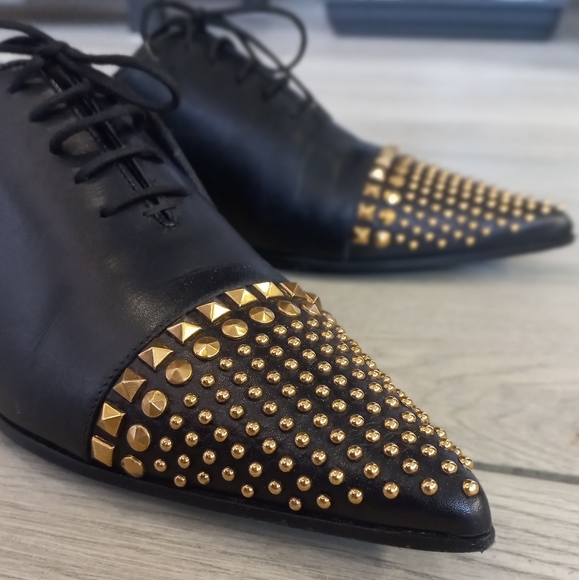 They have been crafted from leather and feature pointed toes with gold-tone studs detailed on them. They flaunt lace-ups on the vamps and come equipped with comfortable insoles.
