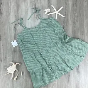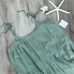 A fun, woven mini dress that has a thin over the shoulder strap design and classic striped print.