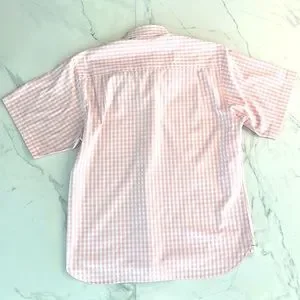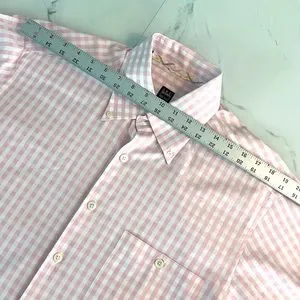 I love this pink & white gingham & IKE BEHAR adds such nice touches to his shirts. Note the coordinating trim on the side vents as well as the inside collar. Loop in case you would like to hang from a hook. The label says L, but I am listing this as XL because it is an unusually large L. Please note the measurements. Gorgeous shirt in excellent condition! 🌸