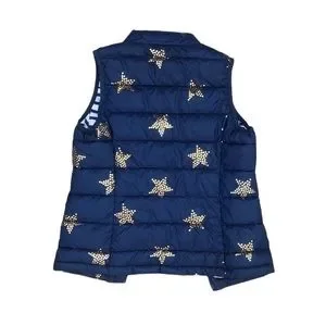 Navy blue puffer vest with gold stars on front and back