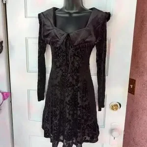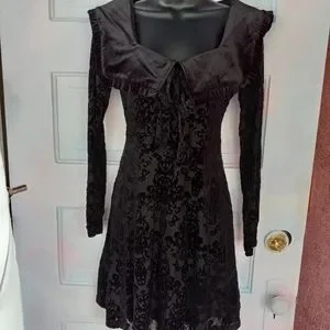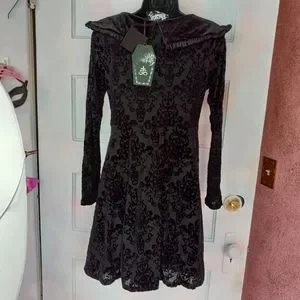 Yall! This beautiful nwt killstar dress is made from velvet and is ridiculously soft, like yaaalll how is this velvet so soft?!? it's lovely yall! ๐ Velvet features a really nice Victorian skull print design all over that's subtle yet gothic cool! wide soft velvet collar gives ultimate Lydia deets and / or Wednesday adams aesthetic! deadstock sold out dress, get it here! slight stretch, sized small but I'd say best fits a medium!!!! small can also wear tho! esp if she has bweebs lol ๐