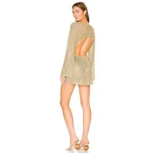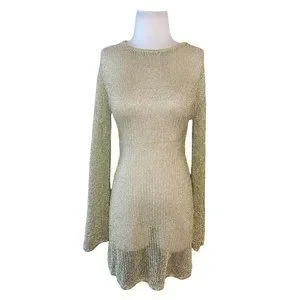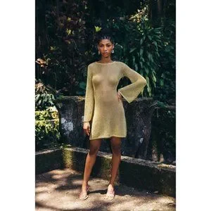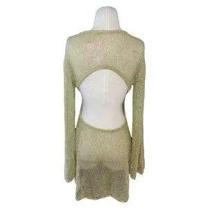 The Hazen Dress is a knit mini fashioned from delicately knit gold chainmail metallic yarn. The mini dress length and bell sleeves create a seductive silhouette which is further enriched by the open back below the shoulders.