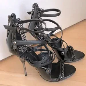 Black strappy sandals with gunmetal/black pyramid stud and chain accents